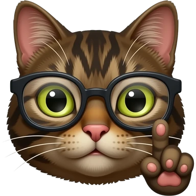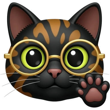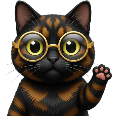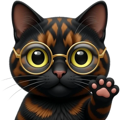 A black Tortoiseshell cat face emoji looking like an eager professor with round gold glassed and paw up with one pad raised. Only face and cat paw. emoji