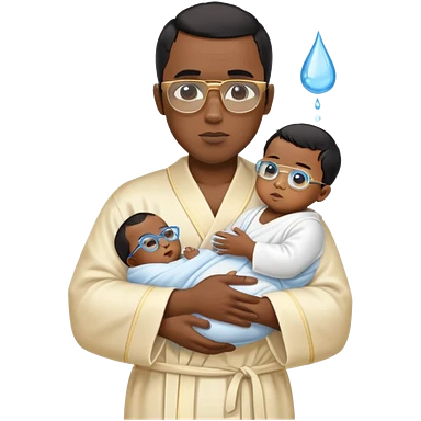 A black male named diddy with short black hair and gold and blue rectangular glasses wearing nothing but a white robe while he holds a baby and baby oil emoji