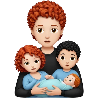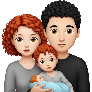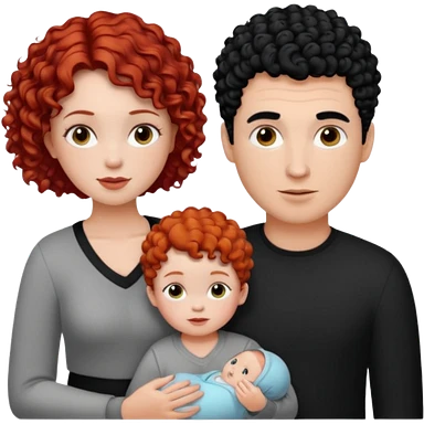 Create a picture of a family of three: a white woman with short, curly red hair, a white man with black hair, and a white baby girl with curly black hair. emoji