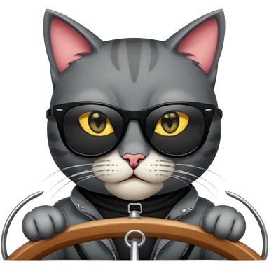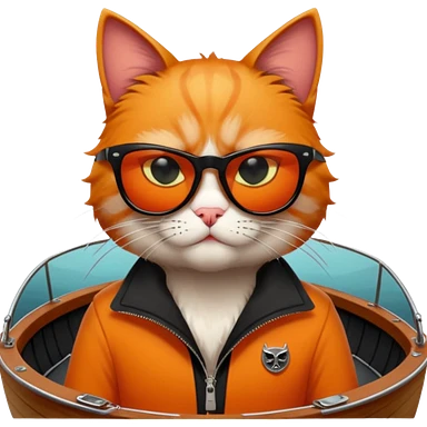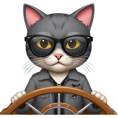 a bad kitty behind the helm of a boat. make the cat look devlishish with a pair of black ray bans wayfers on. driving the boat emoji