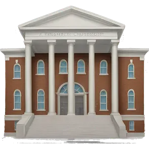 A balanced golden scale symbolizing justice, standing on a polished wooden judge's desk. Beside it, a wooden gavel rests near an open law book filled with legal texts. The background features a grand courthouse with tall pillars, exuding a sense of authority and fairnessemoji