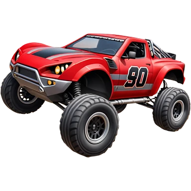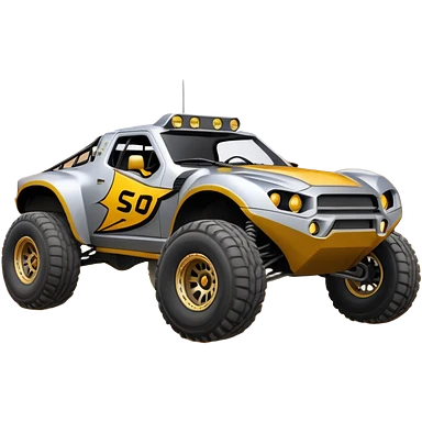 Satan’s (post race) cabaret wide-body Dirty and dented Local Motors Rally Fighter off road race car hot rod trophy truck-style flying on a dusty road (silver wheels) emoji