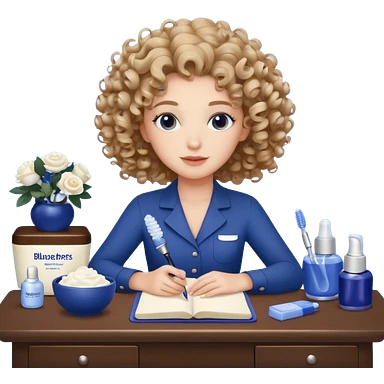 Girl with curly hair with a desk in front of her with blueberries, skin care, white roses, and the girl is doing her hair so there should be a curl mousse curl gel and a diffuser on the desk emoji