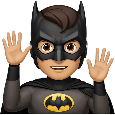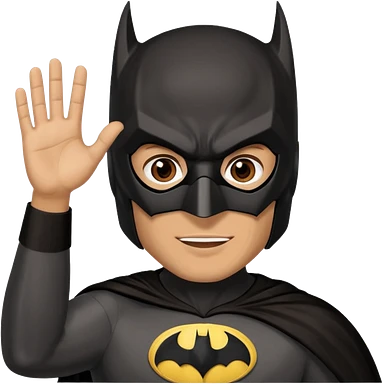 Make a man with brown eyes and dark hair in a Batman costume and mask waving "hello" emoji