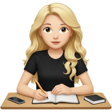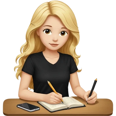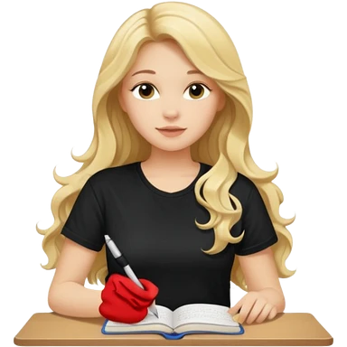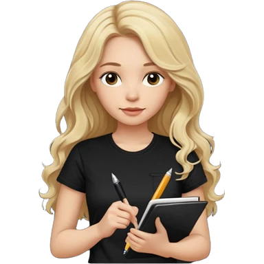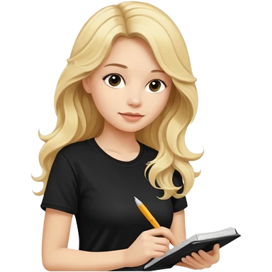 a beautiful blonde with long wavy hair-in-a-black-t shirt-a writes in a diary with a pen emoji