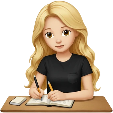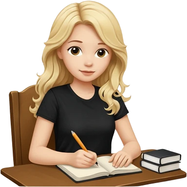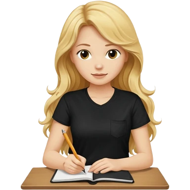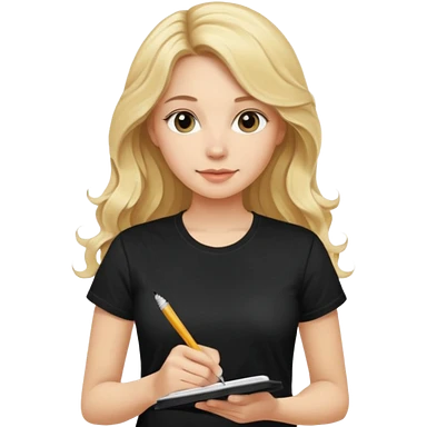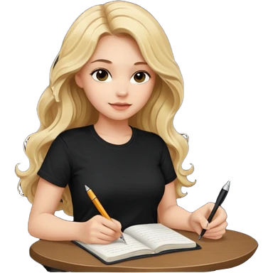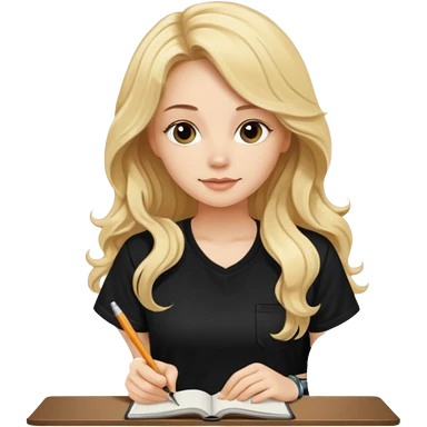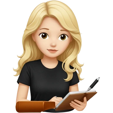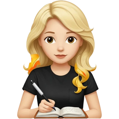 A beautiful blonde with long wavy hair in a black T-shirt sits and writes in a diary with a brown pen. emoji | AI Emoji Generator