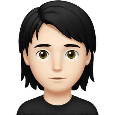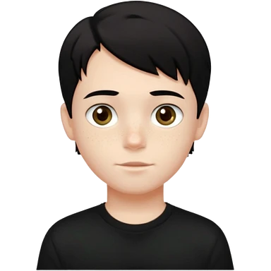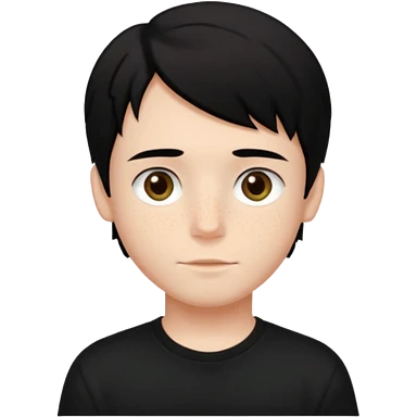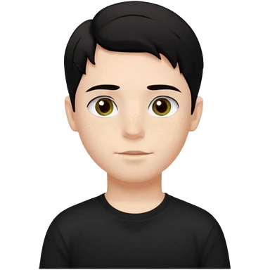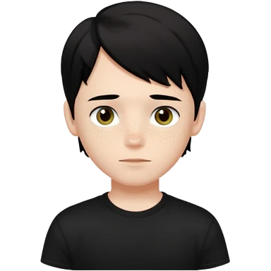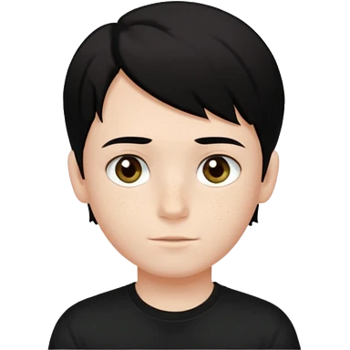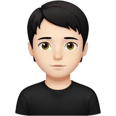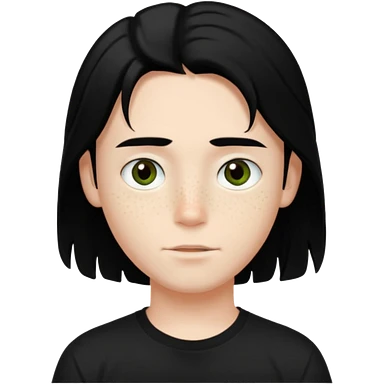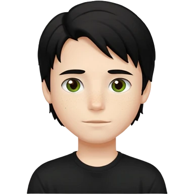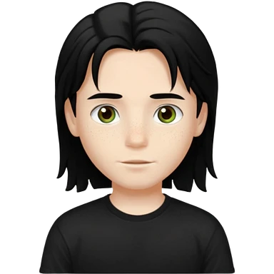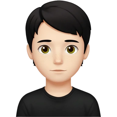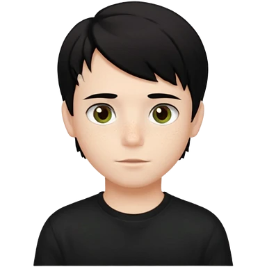 A beautiful boy with black hair and hazel green and brown eyes and white skin , with dark freckles and black t shirt with middle part hair hair with a center part haircut emoji