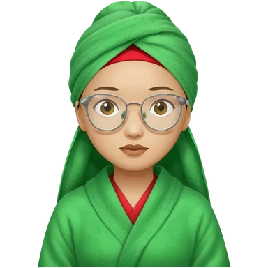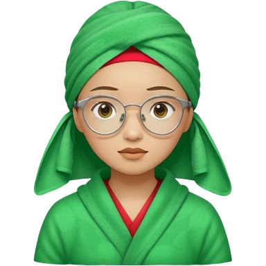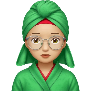 Asian woman wearing a green towel in her head with a broken glasses on her face in red pajamas emoji