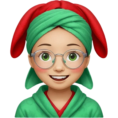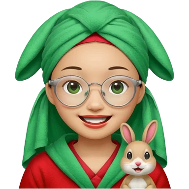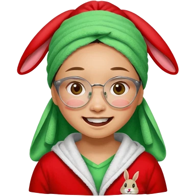 Asian woman wearing a green towel in her head with a broken glasses on her face in red pajamas her smile with rabbit front teeth and the cloth should be red emoji