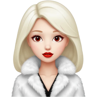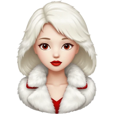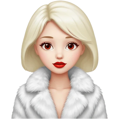 A beautiful, cute girl with red lipstick is posing for a photo in a white fur coat emoji