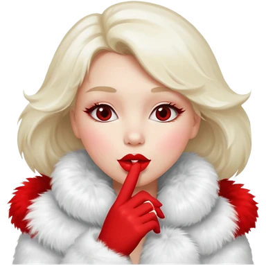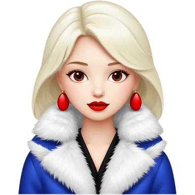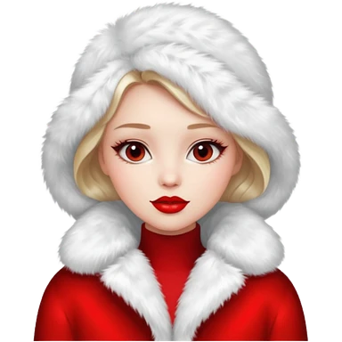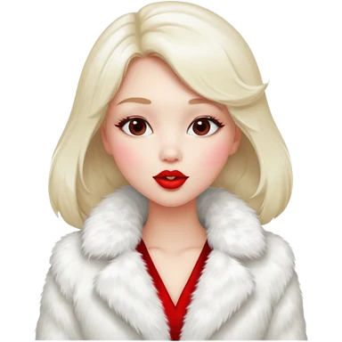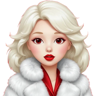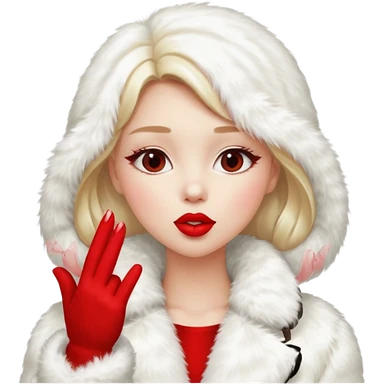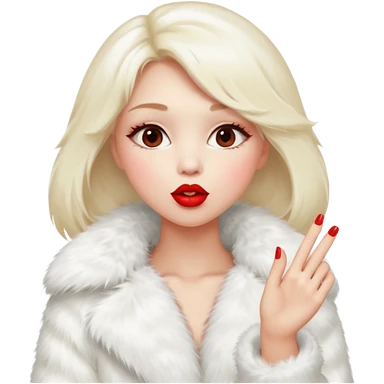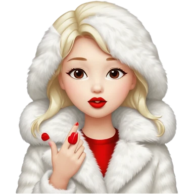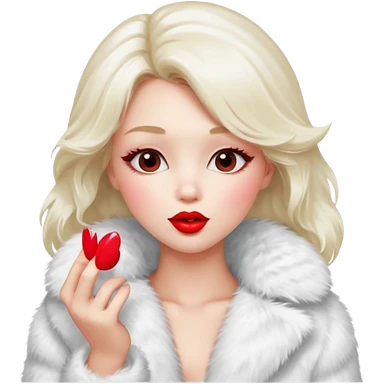 A beautiful, cute girl with red lipstick on her lips in a white fur coat, in full view, blowing a kiss. emoji | AI Emoji Generator