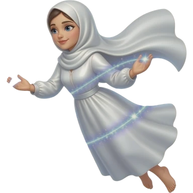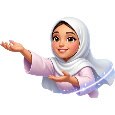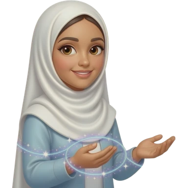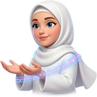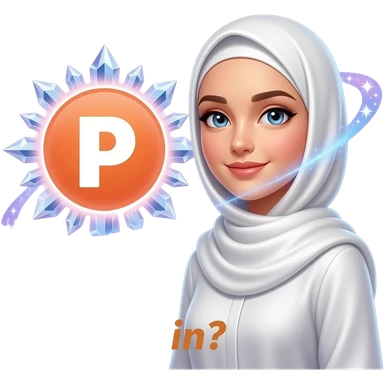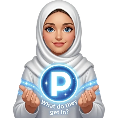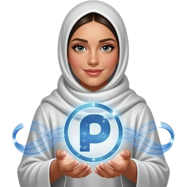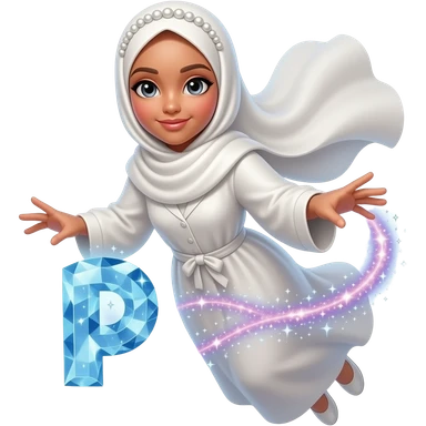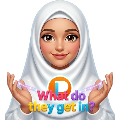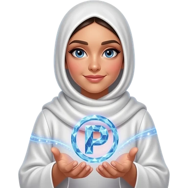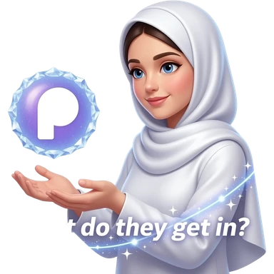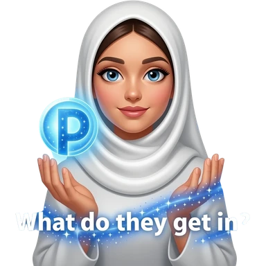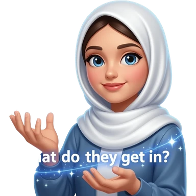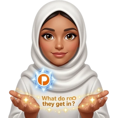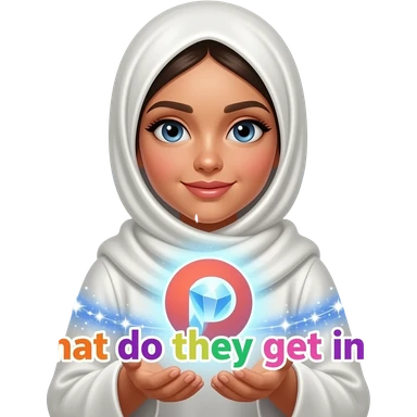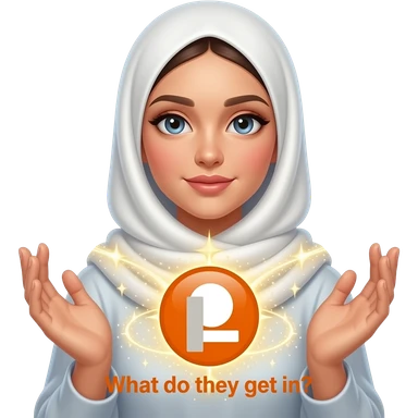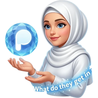 A beautiful woman in a pearl-white satin hijab sitting her left around a glowing, Patreon logo made of crystalline light. Swirling trails of celestial energy and stardust surround her hands, a emerald text: 'What do they get in?'. Isolated on white, soft pastel colors, 3D icon style, ultra-detailed emoji | AI Emoji Generator