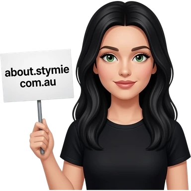 A beautiful woman with long jet black hair green eyes with black eyeliner very very long eyelashes and she has pale skin and wearing a black tshirt and holding a sign saying “about.stymie.com.au” emoji