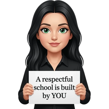 A beautiful woman with long jet black hair and green eyes and pale skin and very long eyelashes wearing a black shirt and holding a sign saying “A respectful school is built by YOU” emoji