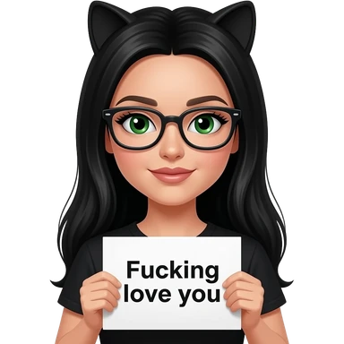 A beautiful woman with long jet black hair, black cats eye glasses and green eyes and pale skin and very long eyelashes wearing a black shirt and holding a sign saying “Fucking love you” emoji
