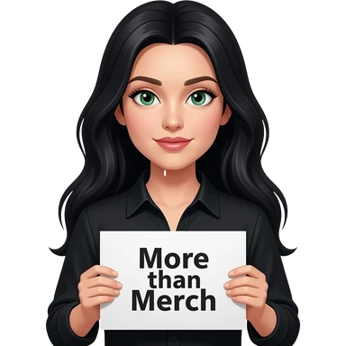 A beautiful woman with long jet black hair and green eyes and pale skin and very long eyelashes wearing a black shirt and holding a sign saying “More than Merch” emoji