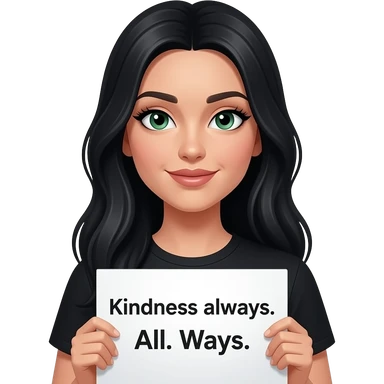 A beautiful woman with long jet black hair green eyes with black eyeliner very very long eyelashes and she has pale skin and wearing a black tshirt and holding a sign saying “Kindness always. All. Ways. ” emoji
