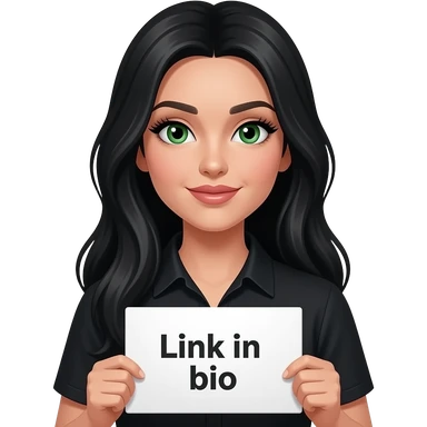 A beautiful woman with long jet black hair and green eyes and pale skin and very long eyelashes wearing a black shirt and holding a sign saying “Link in bio” emoji