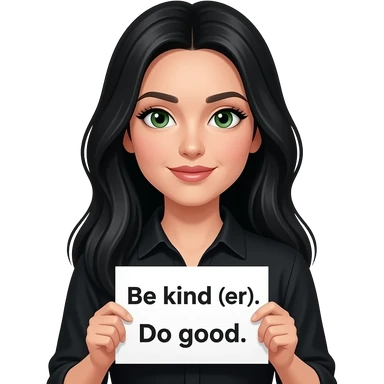 A beautiful woman with long jet black hair and green eyes and pale skin and very long eyelashes wearing a black shirt and holding a sign saying “Be kind (er). Do good. ” emoji