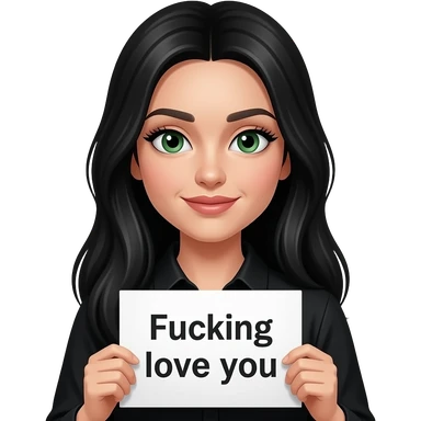 A beautiful woman with long jet black hair and green eyes and pale skin and very long eyelashes wearing a black shirt and holding a sign saying “Fucking love you” emoji