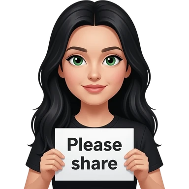 A beautiful woman with long jet black hair green eyes with black eyeliner very very long eyelashes and she has pale skin and wearing a black tshirt and holding a sign saying “Please share ” emoji