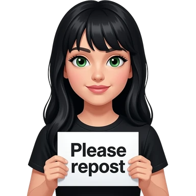 A beautiful woman with long jet black hair green eyes with black eyeliner very very long eyelashes and she has pale skin and wearing a black tshirt and holding a sign saying “Please repost” emoji