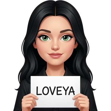 A beautiful woman with long jet black hair, and green eyes with black eyeliner and she has pale skin and very long eyelashes wearing a black shirt and holding a sign saying “LOVEYA” emoji