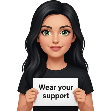 A beautiful woman with long jet black hair green eyes with black eyeliner very very long eyelashes and she has pale skin and wearing a black tshirt and holding a sign saying “Wear your support” emoji