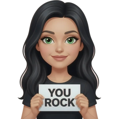 A beautiful woman with long jet black hair green eyes with black eyeliner very very long eyelashes and she has pale skin and wearing a black tshirt and holding a sign saying “YOU ROCK” emoji