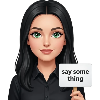 A beautiful woman with long jet black hair and green eyes and pale skin and very long eyelashes wearing a black shirt and holding a sign saying “say some thing” emoji