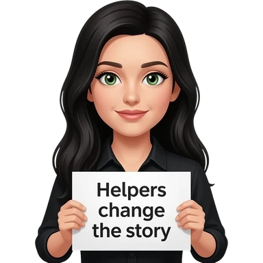 A beautiful woman with long jet black hair and green eyes and pale skin and very long eyelashes wearing a black shirt and holding a sign saying “Helpers change the story” emoji
