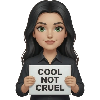 A beautiful woman with long jet black hair and green eyes and pale skin and very long eyelashes wearing a black shirt and holding a sign saying “COOL NOT CRUEL” emoji