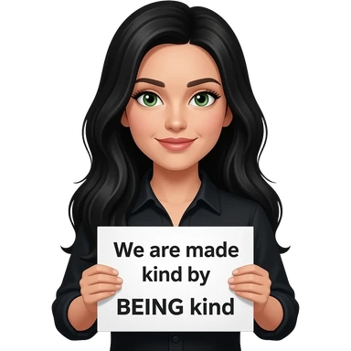 A beautiful woman with long jet black hair and green eyes and pale skin and very long eyelashes wearing a black shirt and holding a sign saying “We are made kind by BEING kind” emoji