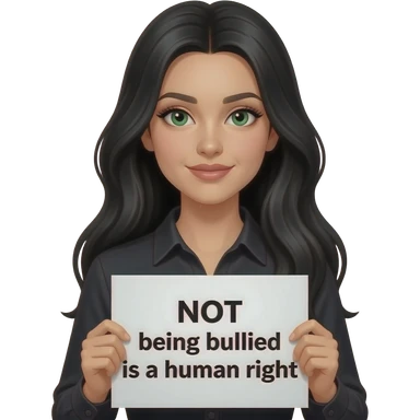 A beautiful woman with long jet black hair and green eyes and pale skin and very long eyelashes wearing a black shirt and holding a sign saying “NOT being bullied is a human right” emoji