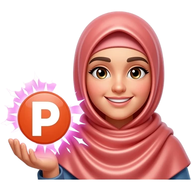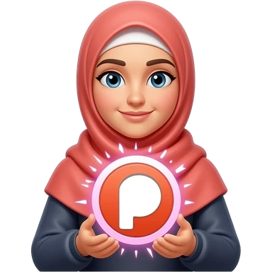 A beautiful young Muslim woman in a shimmering coral hijab, holding a glowing, 3D Patreon logo (the round 'P' icon) that emits warm pink and white sparks. Text below: 'Do you want Content Maker?'. Clean white background, high-quality sticker style emoji | AI Emoji Generator