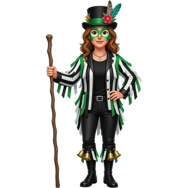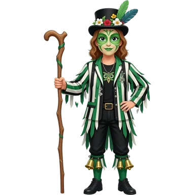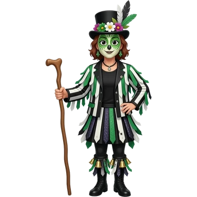 A Female Morris dancers carrying a stick with a ragged jacket in black white and green stripes with the occasional piece of sparkly fabric. A top hat decorated with lots of feathers flowers and green face paint that looks like an owl.back t shirt. Bells below the knees emoji