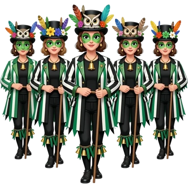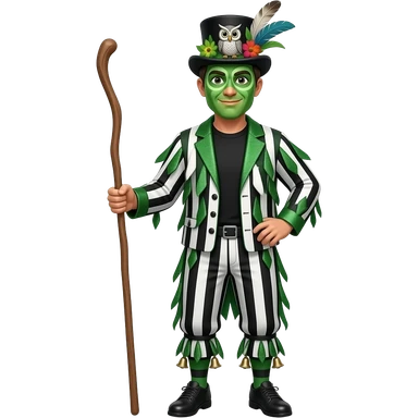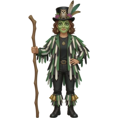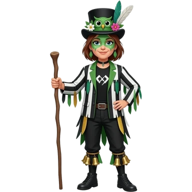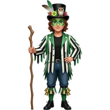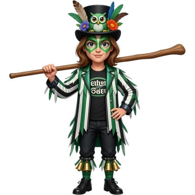 A Female Morris dancer carrying a stick with a ragged jacket in black white and green stripes with the occasional piece of sparkly fabric. A black tshirt. A top hat decorated with lots of feathers flowers and an owl. green face paint that looks like an owl. Bells below the knees emoji