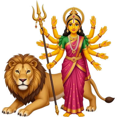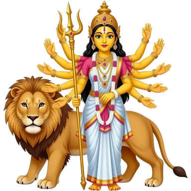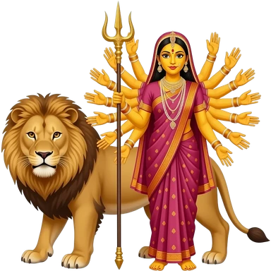 A bengali yellow skinned bride with exactly ten empty hands standing beside a lion with ALL hands in front and her very two front arms should hold a mighty trident emoji