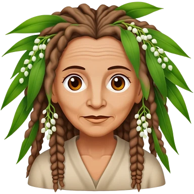 older woman with a tan, brown eyes, her hair and dreadlocks are made from lily of the valley emoji