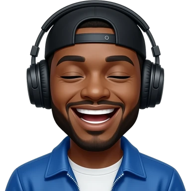 A black person bit brown is with headphones on and have a durag on his headwhich is black and is wearing a blue jacket and his face expression is like his eyes are closed and he is holding his laugh his lips emoji