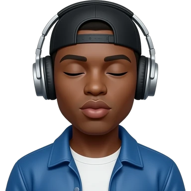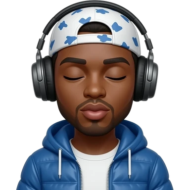 A black person bit brown is with headphones on and have a durag on his head is wearing a blue jacket and his face expression is like his eyes are closed and hes lips are like in kissing form emoji