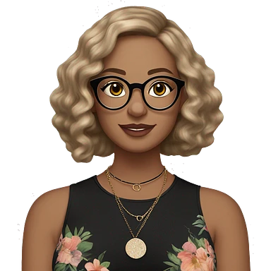 create a girl with light blonde wavy hair and a medium tone skin color. her eyes are almond shaped coffe brown and her eyebrows are brown in colour. she has a medium size nose and light pink thick lips. she is wearing a black top and glasses. emoji