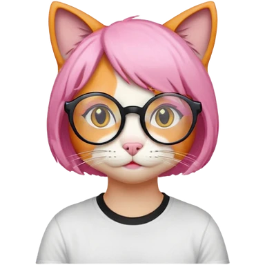 Orange Yellow cat wearing a little pink hair wig, black circle glasses, white T-shirt emoji