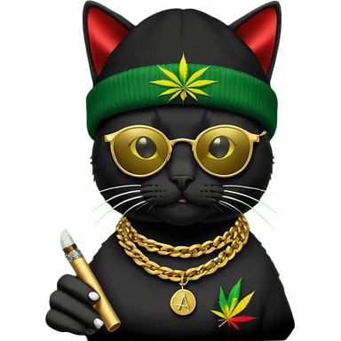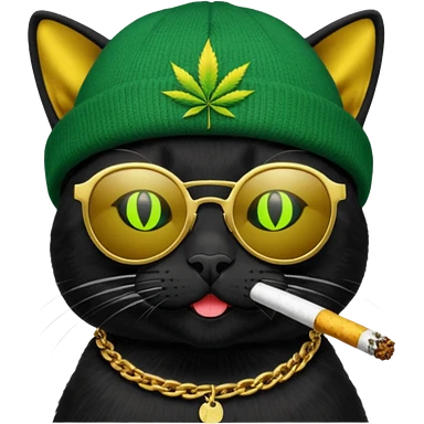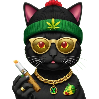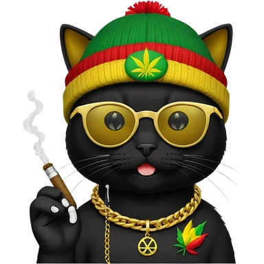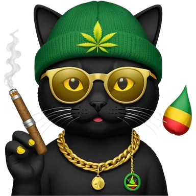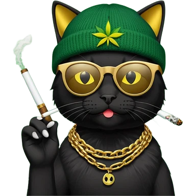 A black cat wearing the deal with it shades and a rasta beanie and smoking a joint and wearing a gold chain that says 420 and the words High Time at the top of the image emoji | AI Emoji Generator