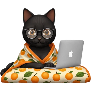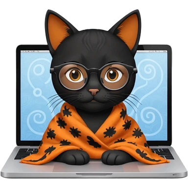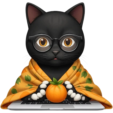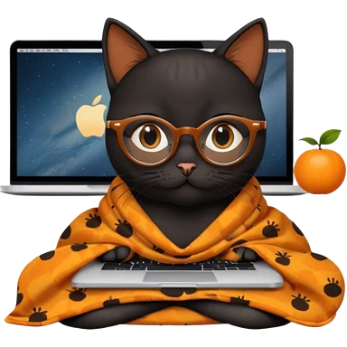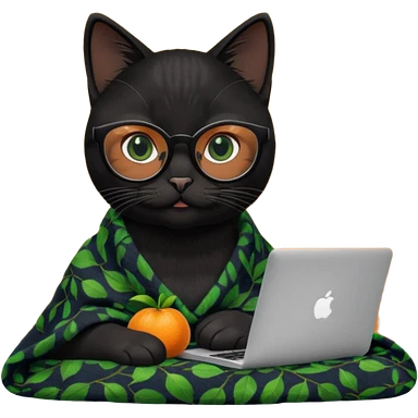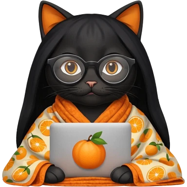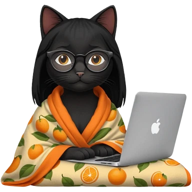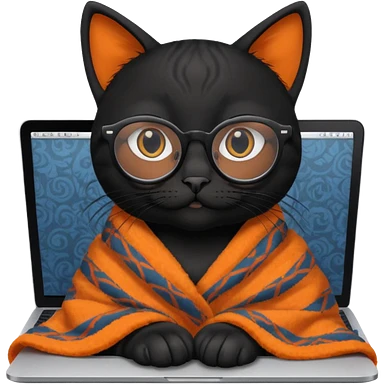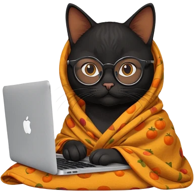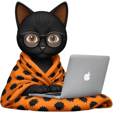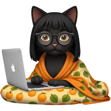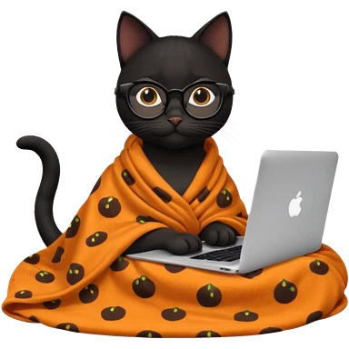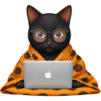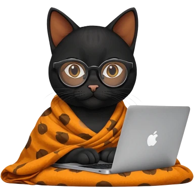 A black female cat working on a MacBook, with long, black straight lashes, round glasses and she wears a blanket with an orange pattern emoji | AI Emoji Generator