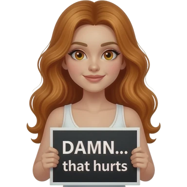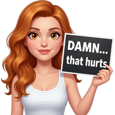 sexy girl with long wavy ginger hair and ginger eyes wearing a white tanktop is holding a black colored sign with DAMN... that hurts written on it emoji