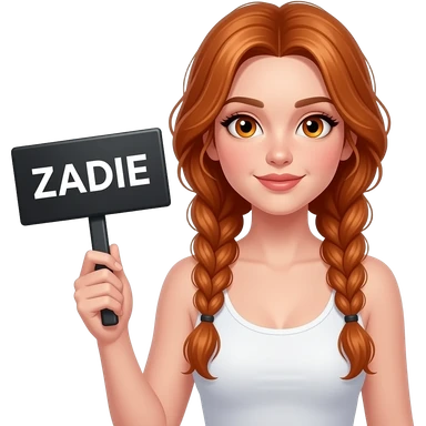 sexy girl with long wavy ginger braids and ginger eyes wearing a white tanktop is holding a black colored sign with ZADIE written on it emoji