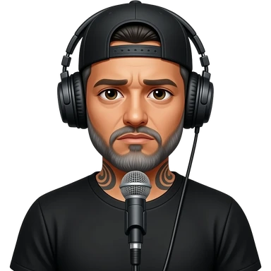 Sad, lonely, divorced wearing all black and a backwards hat tattooed with a beard that’s turning gray Mexican man with headphones in the standing Microphone emoji