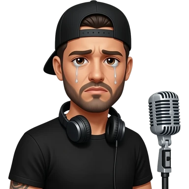 Sad, lonely, with tears running down his face divorced wearing all black and a backwards hat tattooed with a beard that’s turning gray Mexican man with headphones in the standing Microphone emoji