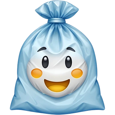 A little black and white cat in a white plastic bag. The cat is mostly black except for white on her nose and paws. The cat has yellow eyes emoji